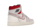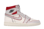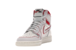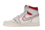 This AJ 1 sports a white upper with red accents, white Nike āSwooshā, white midsole, and a white sole.