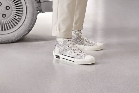 Crafted in canvas with the iconic “newspaper” print, the high-tops feature an innovative clear mesh casing. A black rubber back loop contrasts white laces and a white rubber sole featuring deconstructed and pieced details with a ‘Dior’ logo on the outsole.